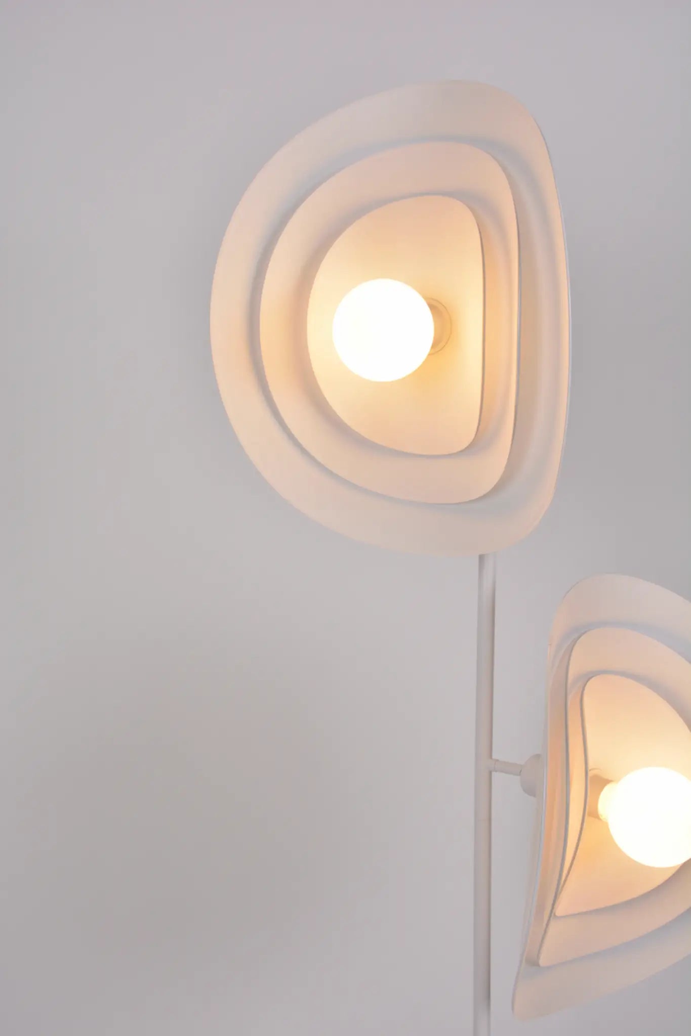 Composé de deux abat-jour ornés de trois feuilles chacun, fabriqués en papier Murano, ce luminaire offre un jeu de lumière doux et chaleureux. Le papier Murano, réputé pour sa finesse et sa texture unique, diffuse la lumière de manière subtile et apaisante, créant ainsi une ambiance intime et chaleureuse.