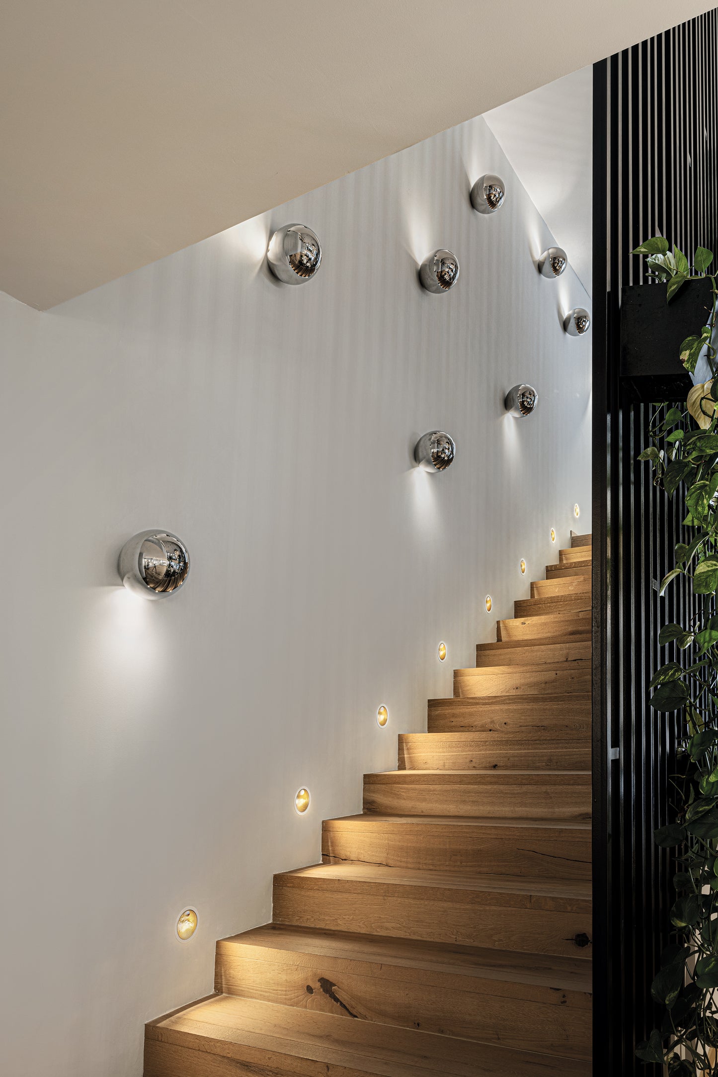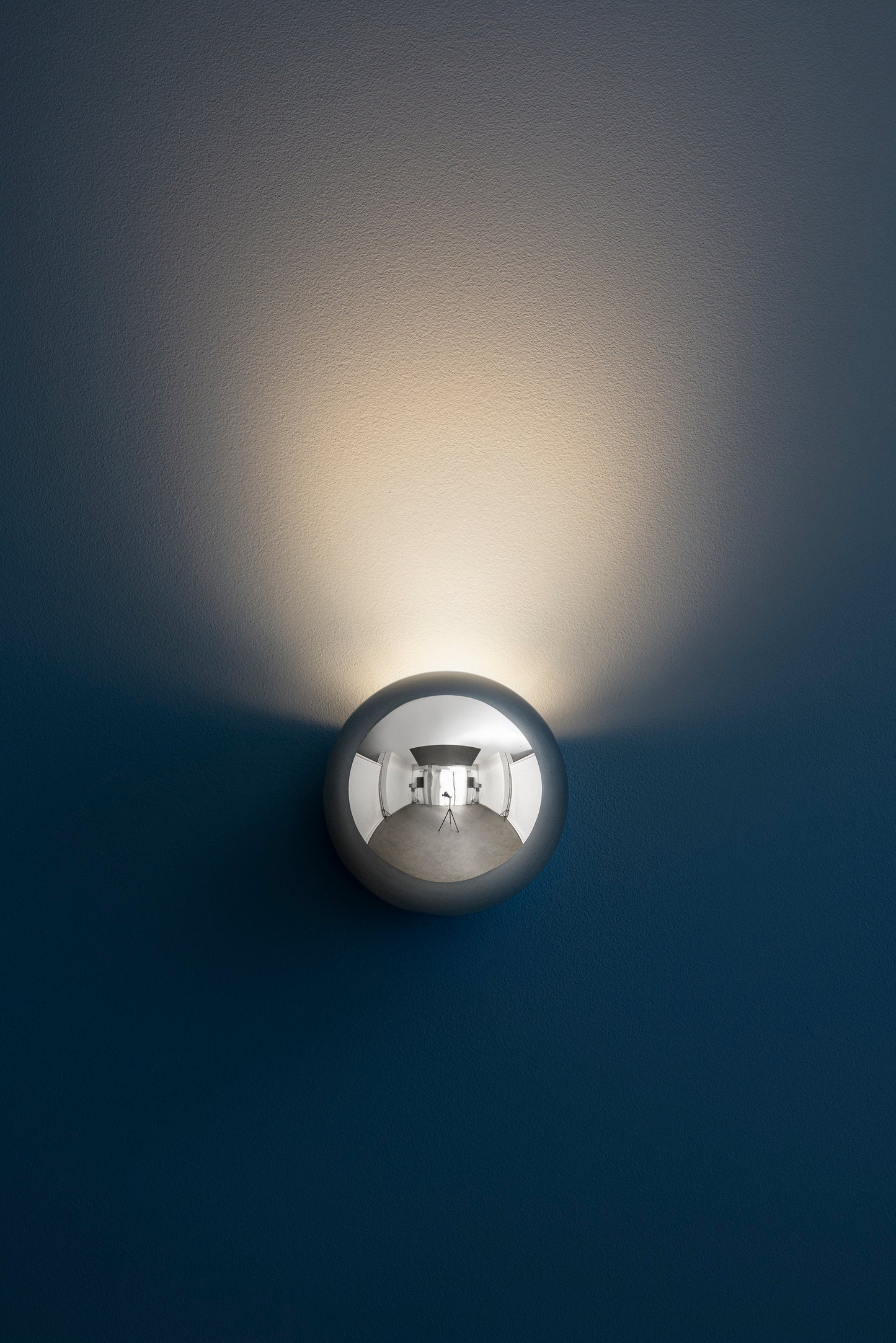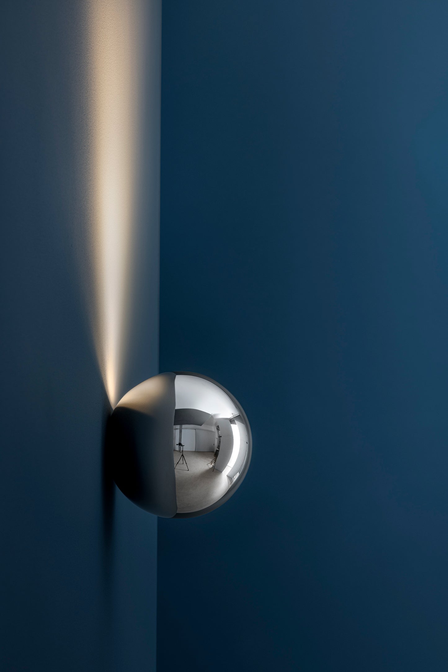 Sfera est une lampe murale inspirée du célèbre autoportrait d'Escher. Elle capture l'image de la personne qui la regarde grâce à un miroir sphérique qui reflète la pièce dans lequel il est placé, et cet aspect la fait évoluer vers une véritable pièce de décoration même lorsqu'elle est éteinte. Adaptée à différents types d'environnements, du living au contract, Sfera se prête bien à des compositions multiples mais est aussi largement utilisée individuellement grâce à son jeu surprenant des images réfléchies.