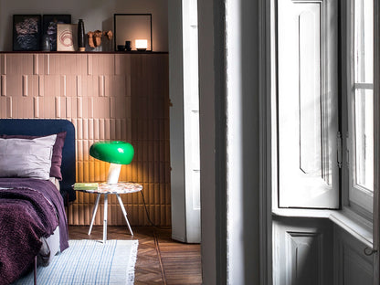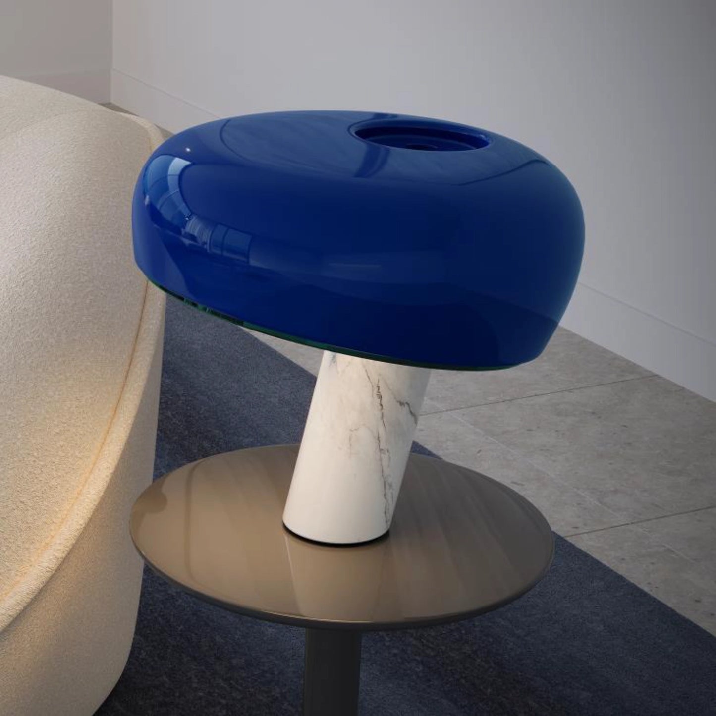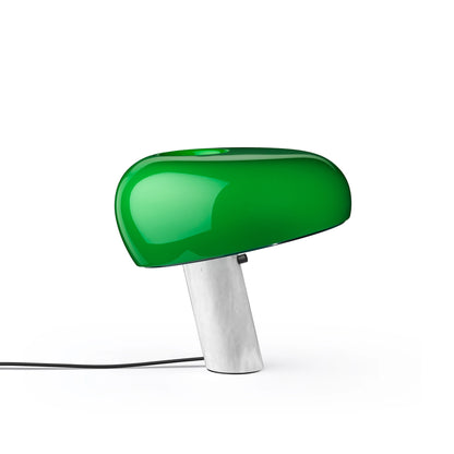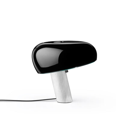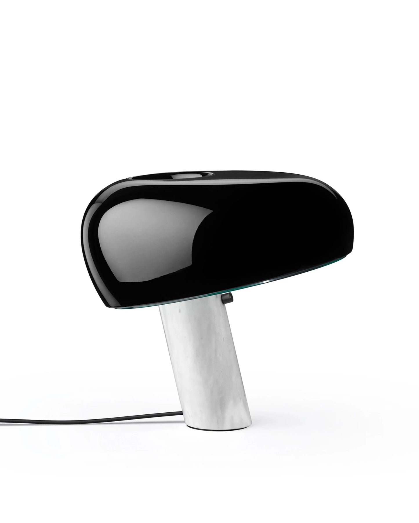 Dessinée par Achille et Pier Giacomo Castiglioni en 1967, et inspirée par le célèbre personnage de dessin animé, cette lampe mythique trouve sa place sur un bureau, dans un salon ou une chambre. L'allumage de l'appareil et la régulation de l'intensité lumineuse se fait par un bouton sur la base en marbre de Carrare blanc L'abat-jour en métal émaillé repose sur une plaque de verre.