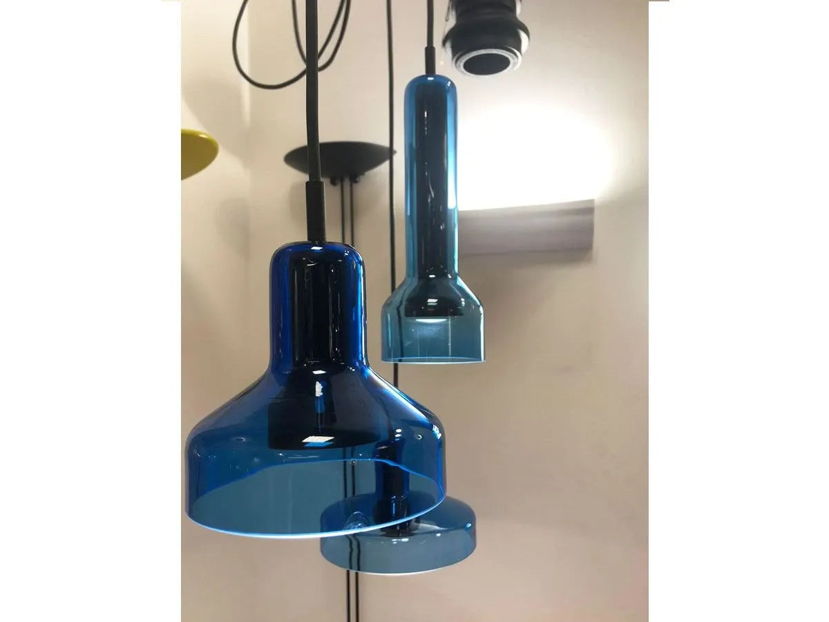 Réalisée en verre soufflé moulé, la suspension Stab Light est fabriquée artisanalement selon les techniques traditionnelles utilisées en Bohème depuis le 19ème siècle. Grâce à sa canne, l’artisan verrier souffle à la bouche plusieurs couches superposées de verre aux coloris différents. Il façonne ensuite à la main le verre afin qu’il prenne la forme du moule en bois dans lequel il sera ensuite inséré. Chaque moule en bois est également fabriqué à la main. Pour finir, chaque pièce est polie manuellement pour atteindre une brillance extrême. L’abat-jour de Stab Light se compose de deux éléments emboîtés. L’abat-jour classique en verre coloré laisse apparaître en transparence un diffuseur moderne en métal noir qui ressemble à une lampe-torche ! La personnalité charismatique de cette suspension s'exprime au travers de l'association de ces deux éléments aux styles et matériaux différents. Le câble est en tissu noir.