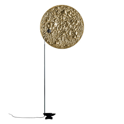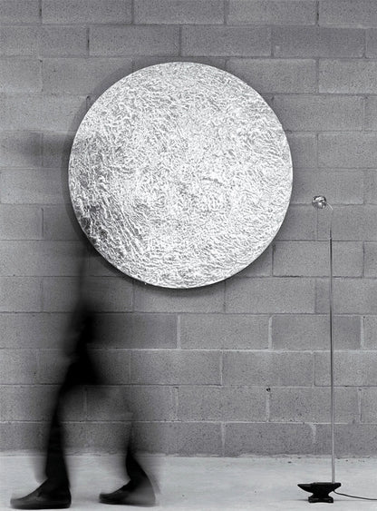 Stchu-Moon sépare la source lumineuse de l’objet éclairant, qui acquiert ainsi une valeur esthétique indépendante. La réfraction de la lumière se confronte ici à des surfaces délibérément irrégulières, qui multiplient la quantité de lumière et rendent l’objet lui-même entièrement lumineux. La lampe de sol Stchu-Moon 08 de Catellani & Smith se compose de deux éléments séparés: le réflecteur est un disque rond en aluminium, fixé au mur. Sa surface présente un relief et est revêtue d'or, d'argent ou de cuivre à la feuille. La lampe de sol est placée devant. Elle est en métal et d'allure sobre et discrète. C'est une simple tige métallique avec une tête de réflecteur. Le socle est une petite enclume de fer. La tête de réflecteur éclaire le disque métallique au mur, de sorte que la lumière est multipliée magiquement par une structure de surface irrégulière et reflétée.
