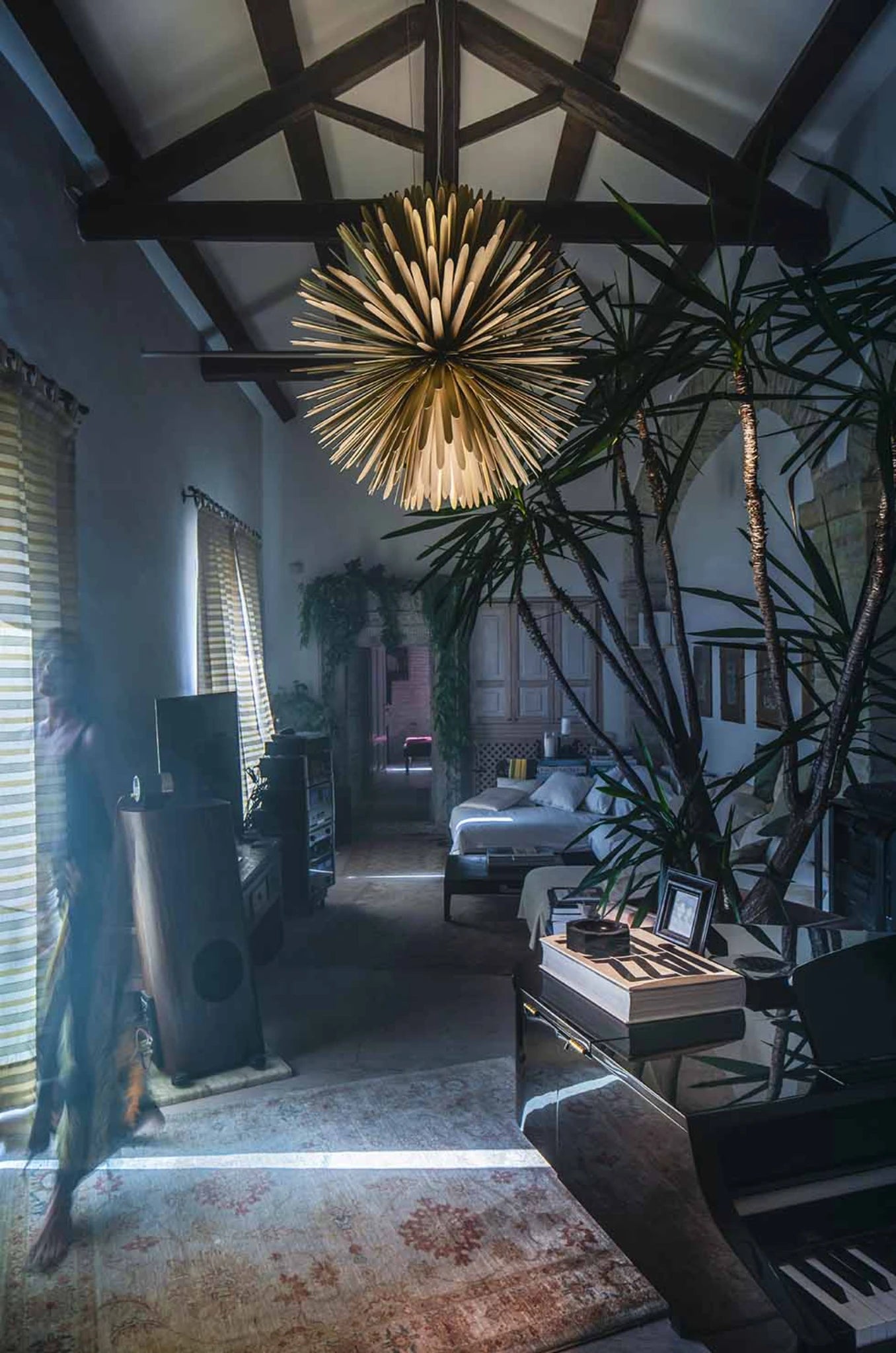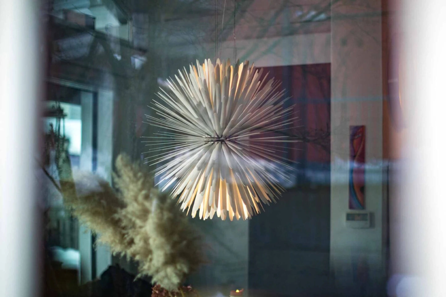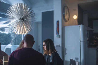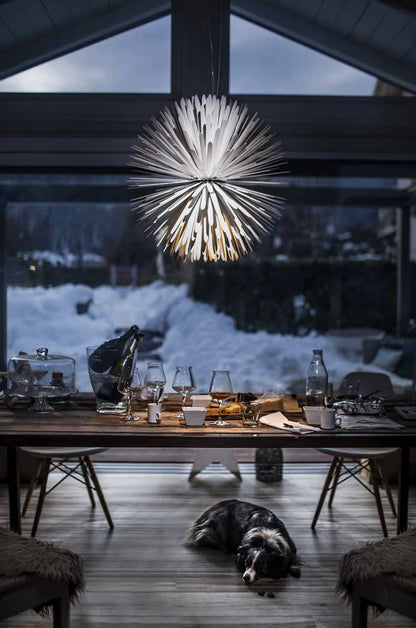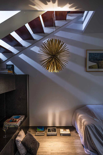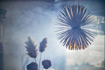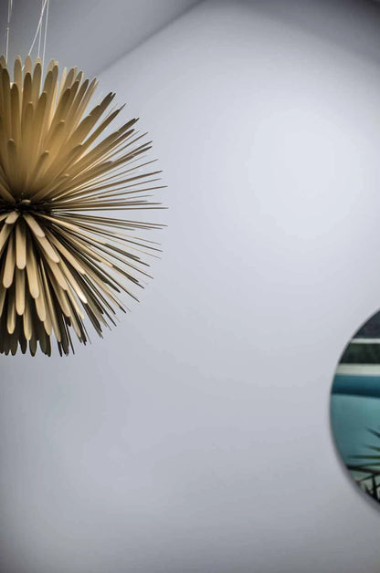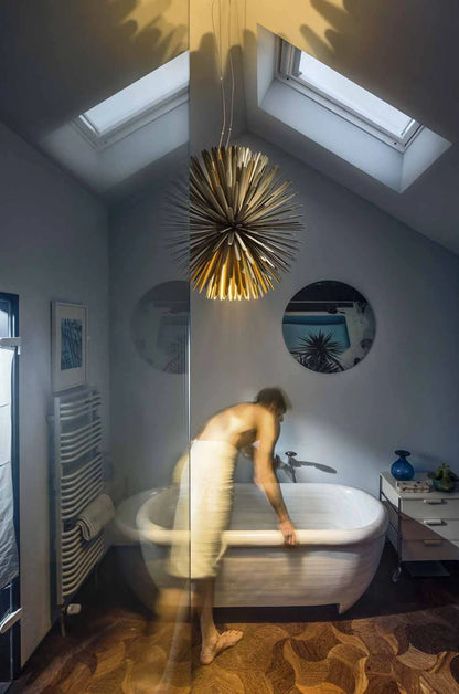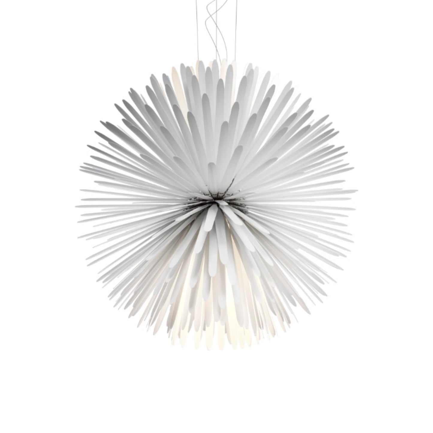 La structure sphérique de la suspension Sun-Light of love Foscarini représente les rayons du soleil. Une suspension graphique et décorative réalisée à la manière d'une sculpture baroque. Conçue en acier et en aluminium peint par liquide, cette suspension se compose de 390 faisceaux formant une platine.