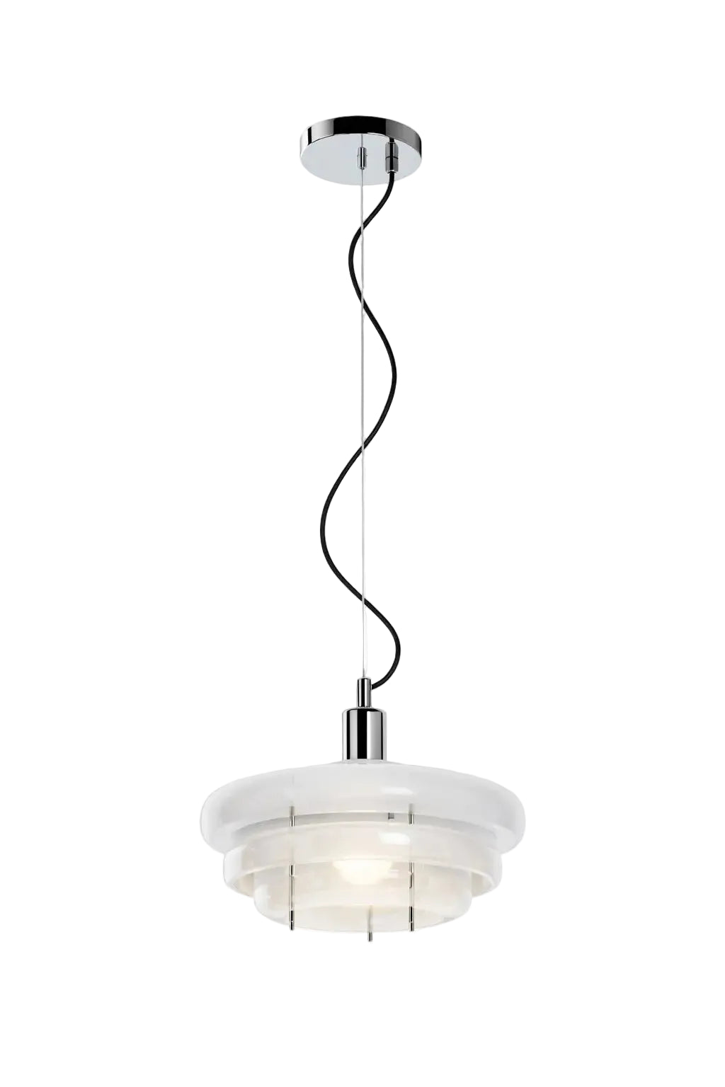 La suspension Sunset 1L se distingue par sa composition sculpturale : une superposition de trois abat-jour cylindriques en verre transparent coloré, suspendus avec élégance grâce à une cordelière dotée d’un filin réglable en hauteur et complétés par un pavillon en métal. Cette construction en strates donne naissance à un luminaire au fort impact visuel, aussi décoratif éteint qu’allumé.
