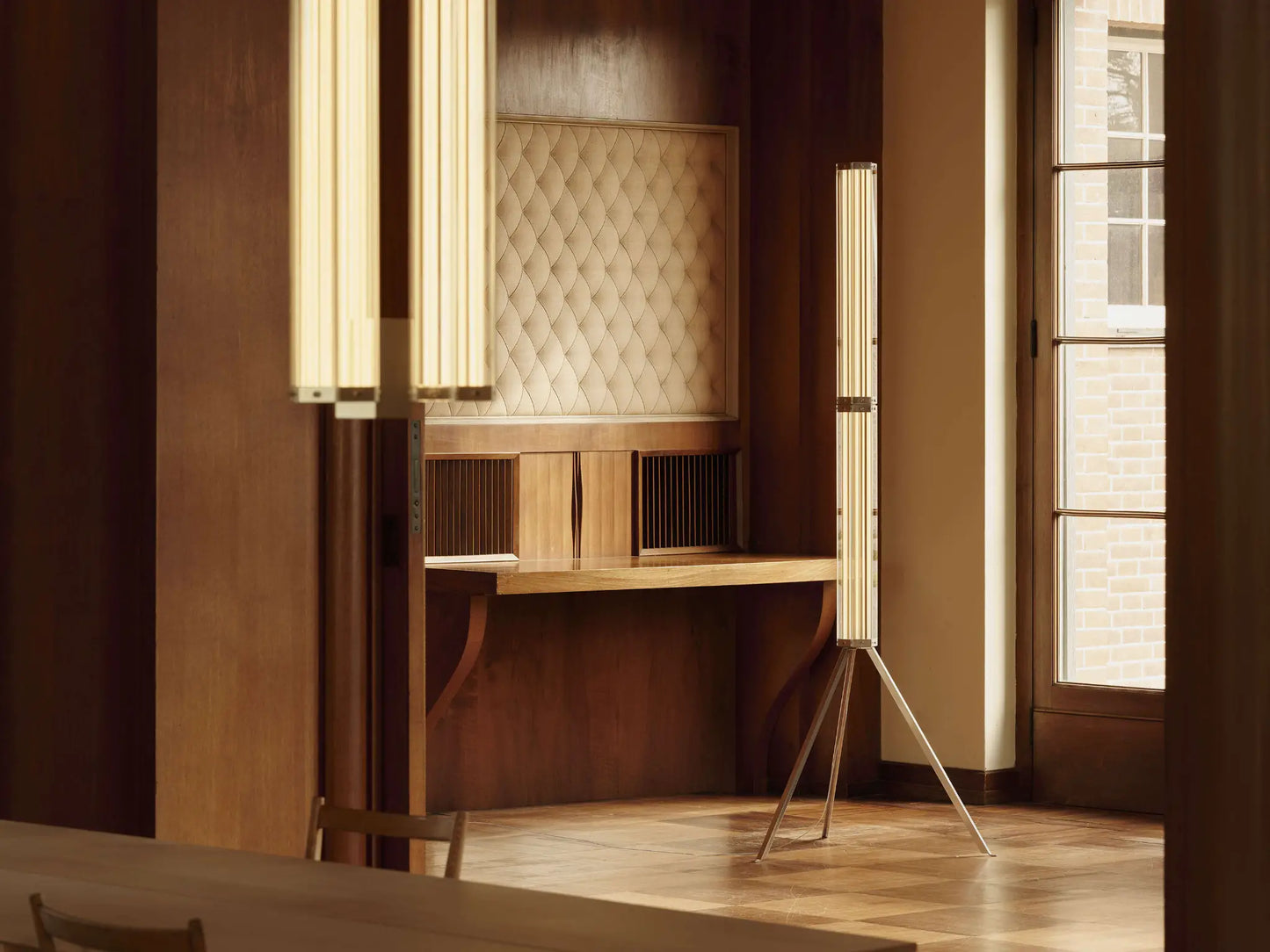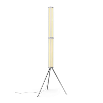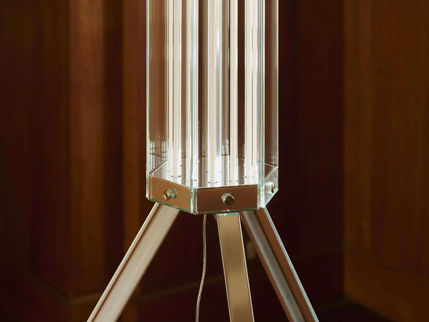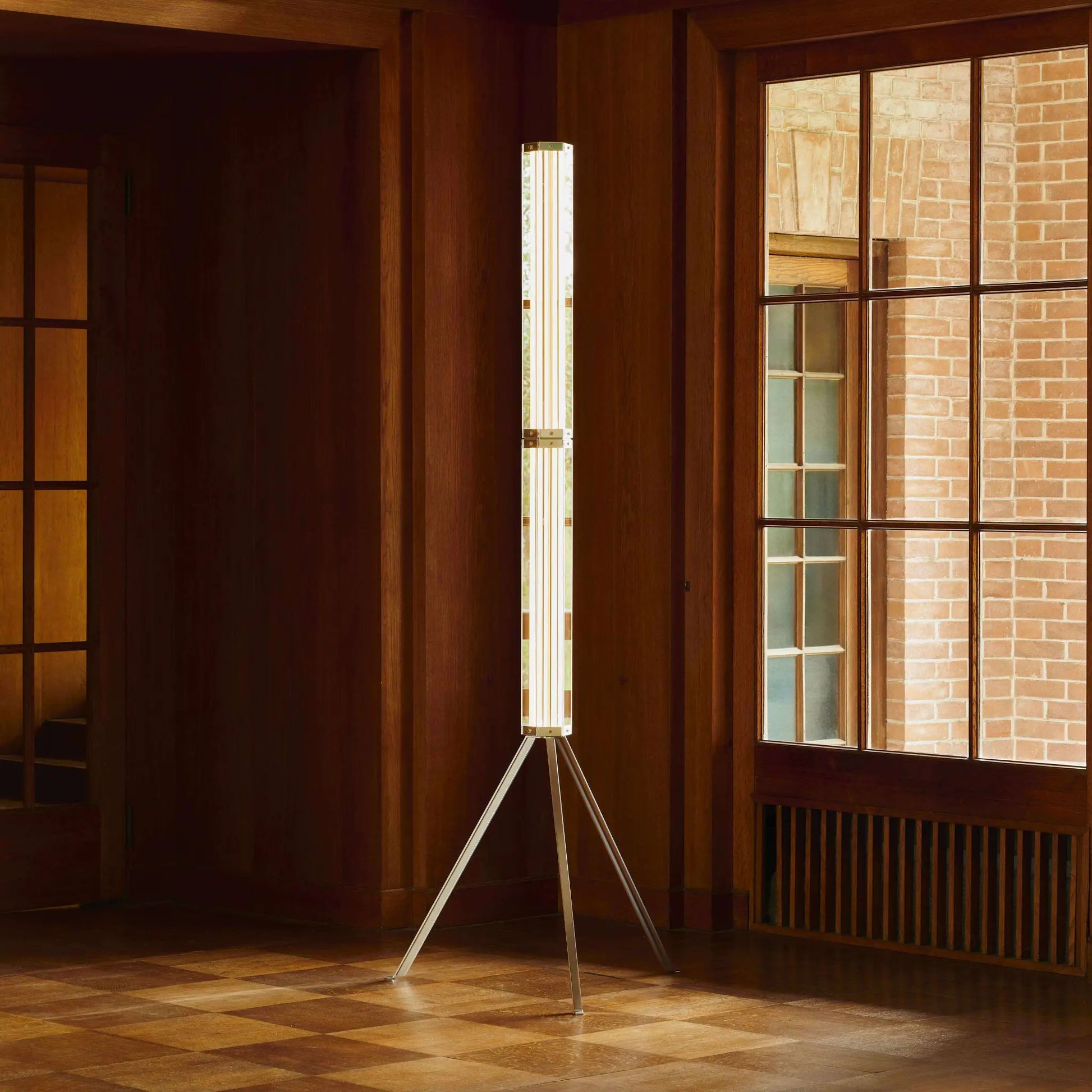 Le lampadaire SuperWire F par le designer Formafantasma est composé de verre et d'aluminium poli, son design est né du développement d'une source lumineuse sur mesure qui émet une lumière chaude et homogène.