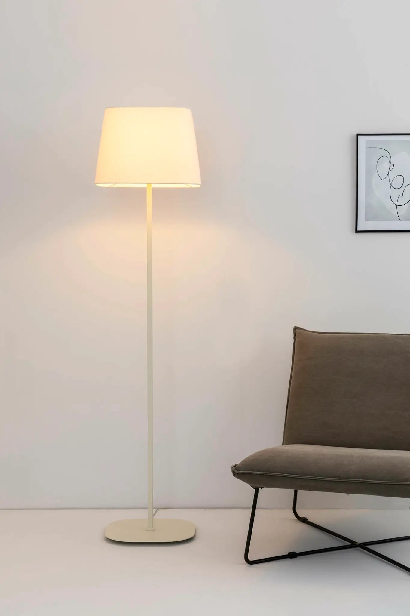 Lampadaire moderne en métal et textile blanc, conçu par Estudi Ribaudí. Parfait pour un éclairage d’ambiance élégant et discret.