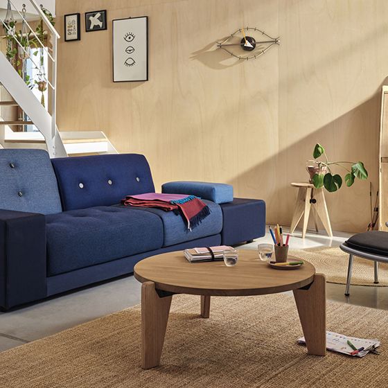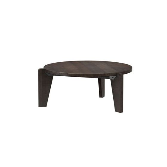 La table basse ronde Guéridon Bas conçue en 1944 porte l'inimitable signature du créateur et ingénieur français Jean Prouvé. Au début des années 1940, Jean Prouvé se consacra de plus en plus au travail du bois. La table Guéridon Bas est composée d‘un lourd plateau en chêne massif ou en noyer américain reposant sur trois pieds élaborés dans le même bois. Ces éléments sont reliés entre eux par une structure robuste composée de tôle pliée. Disponible en différentes essences de bois, cette table pleine de retenue, dans la pure lignée moderniste, s’adapte aux aménagements les plus divers.