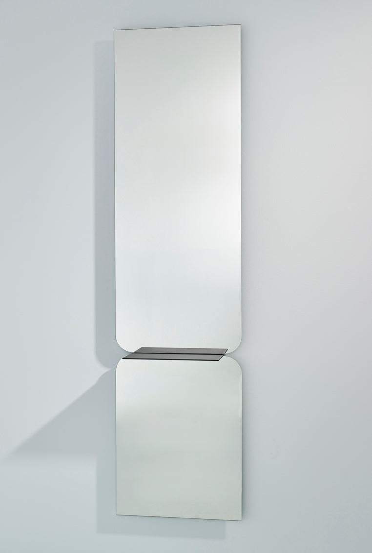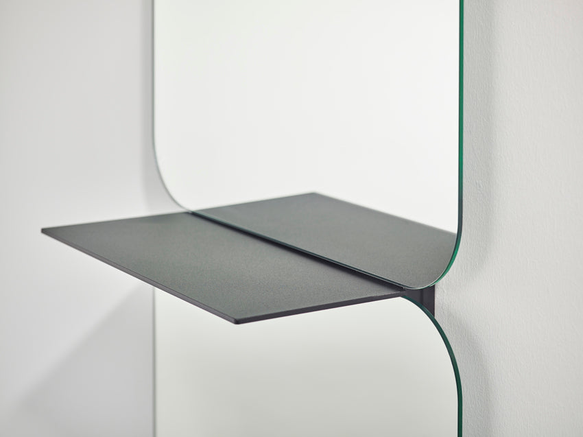 Un élégant miroir équipé d’une étagère en aluminium poudré. En recentrant par jeu d’optique le miroir, de la place est créée pour l’étagère de manière ludique et amusante. Vous pouvez y placer la déco adaptée pour personnaliser encore plus ce miroir et votre intérieur.