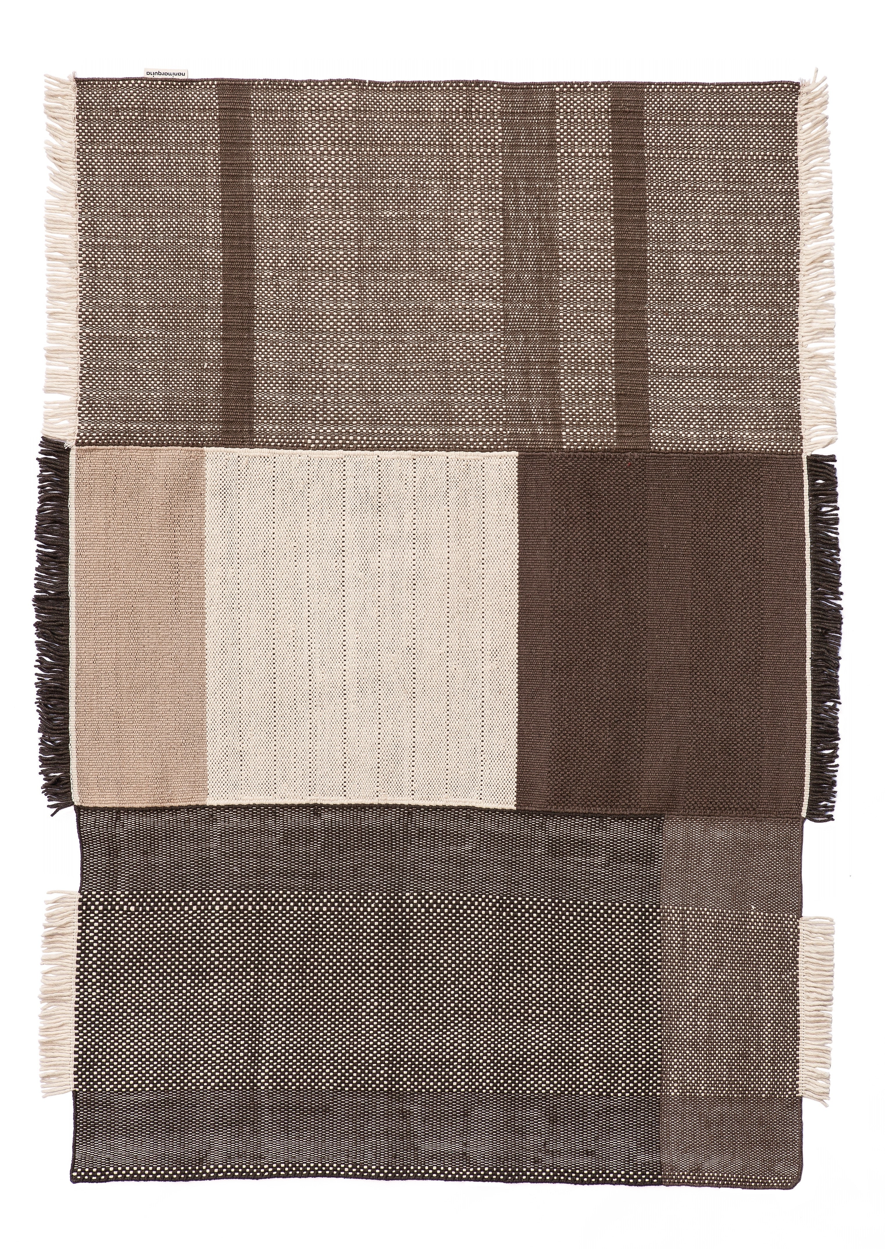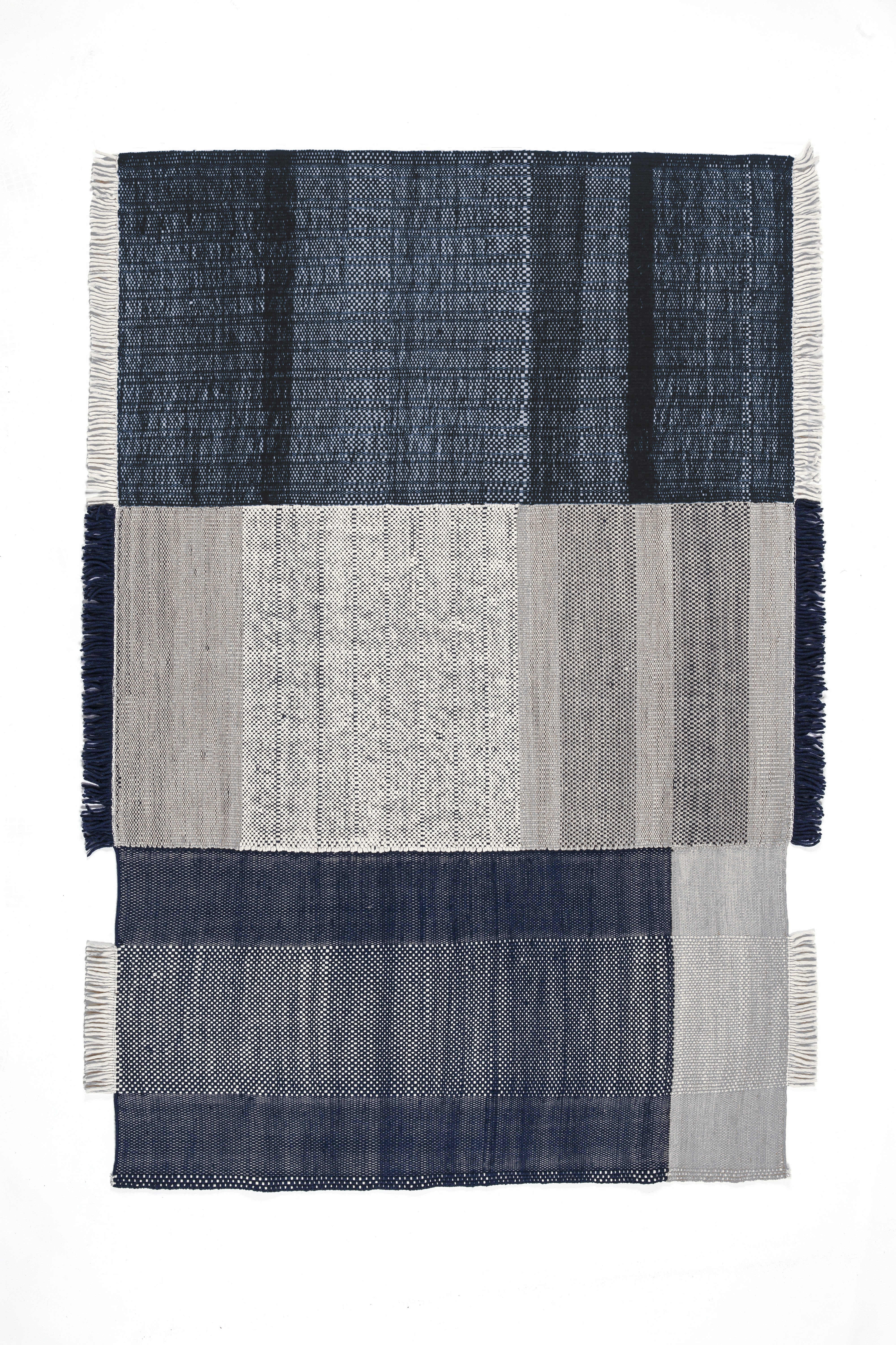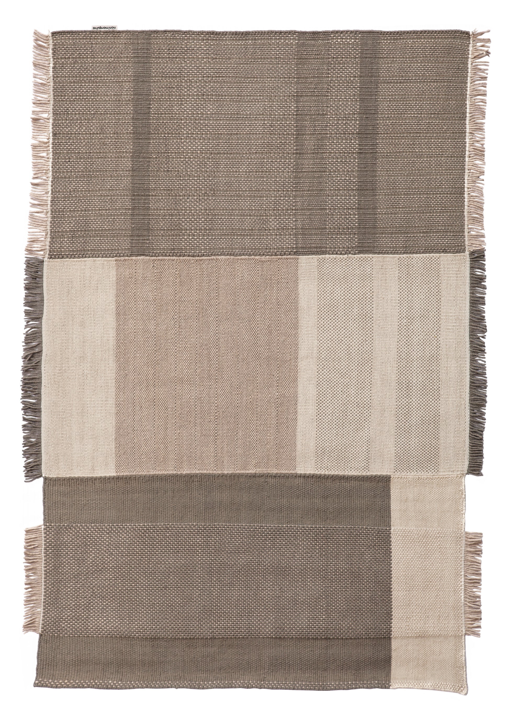 Tres est un tapis traditionnel indien à tissage plat. Sa qualité unique réside dans la production de trois parties indépendantes dans lesquelles différentes fibres prédominent. La proportion et la combinaison de la laine, du feutre et du coton génèrent des changements de ton et des irrégularités dans le tissage, donnant vie au motif. La collection met en valeur la structure de tissage dans un style quasi pédagogique, sans crainte de révéler son mystère. Les franges aident également à comprendre le processus de construction améliorant ainsi la différenciation entre les trois pièces qui se mélangent finalement de façon invisible.