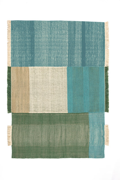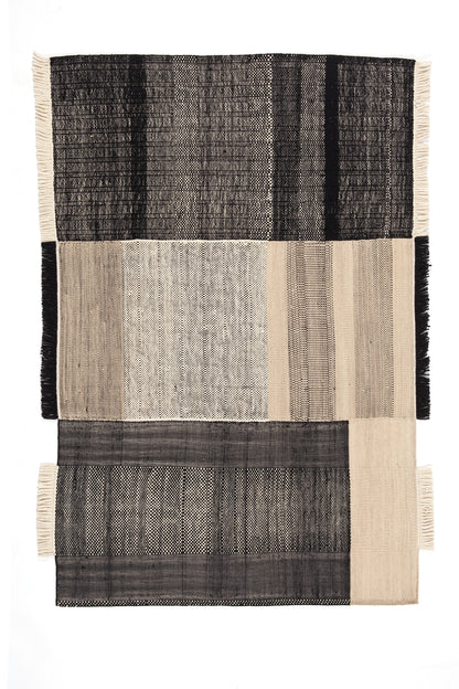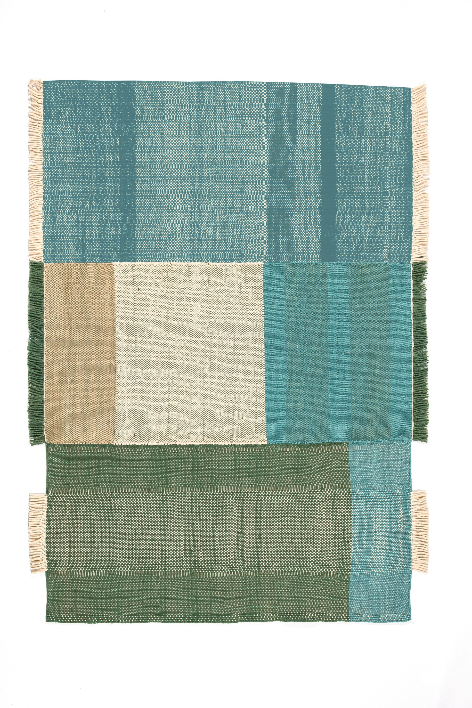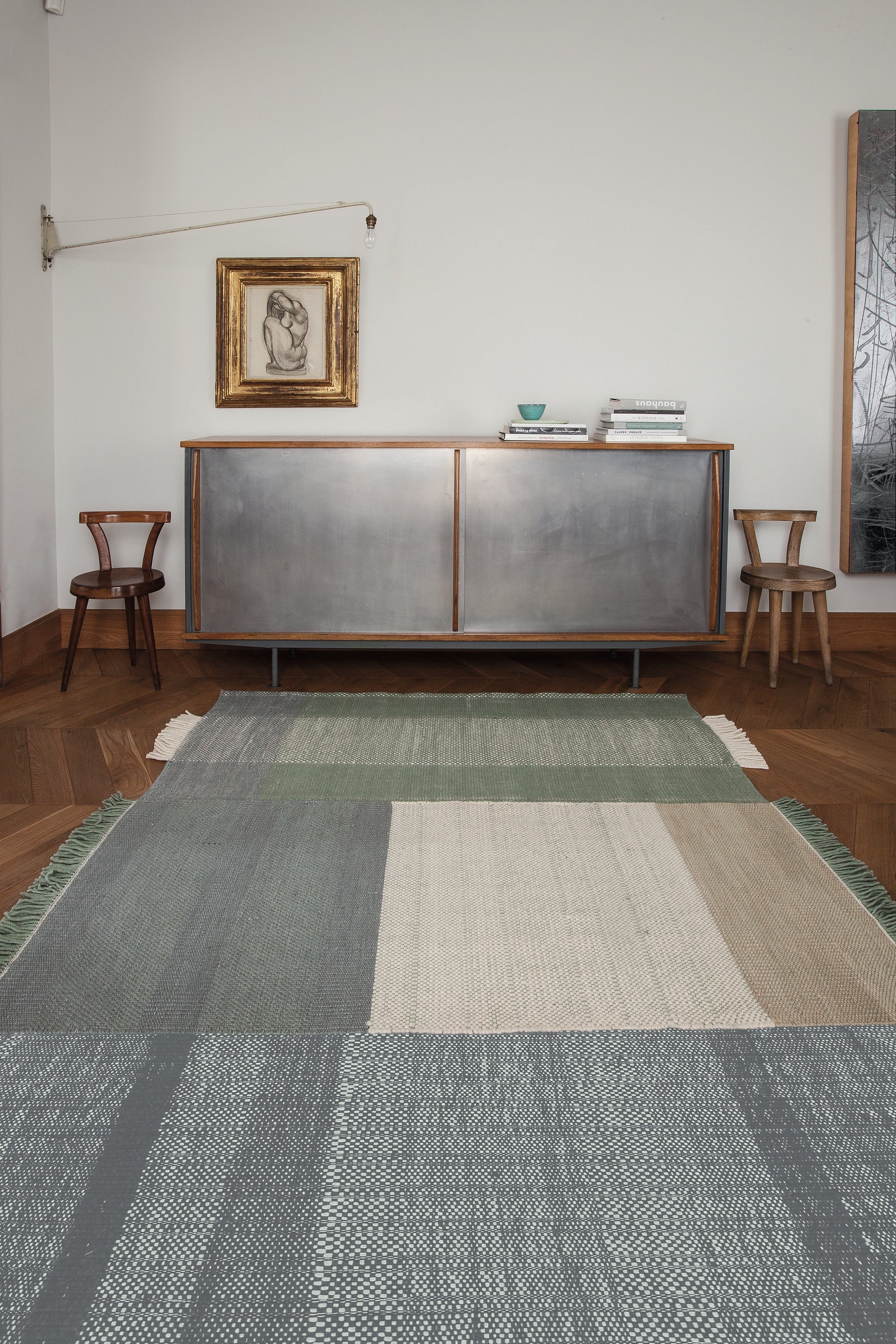 Tres est un tapis traditionnel indien à tissage plat. Sa qualité unique réside dans la production de trois parties indépendantes dans lesquelles différentes fibres prédominent. La proportion et la combinaison de la laine, du feutre et du coton génèrent des changements de ton et des irrégularités dans le tissage, donnant vie au motif. La collection met en valeur la structure de tissage dans un style quasi pédagogique, sans crainte de révéler son mystère. Les franges aident également à comprendre le processus de construction améliorant ainsi la différenciation entre les trois pièces qui se mélangent finalement de façon invisible.