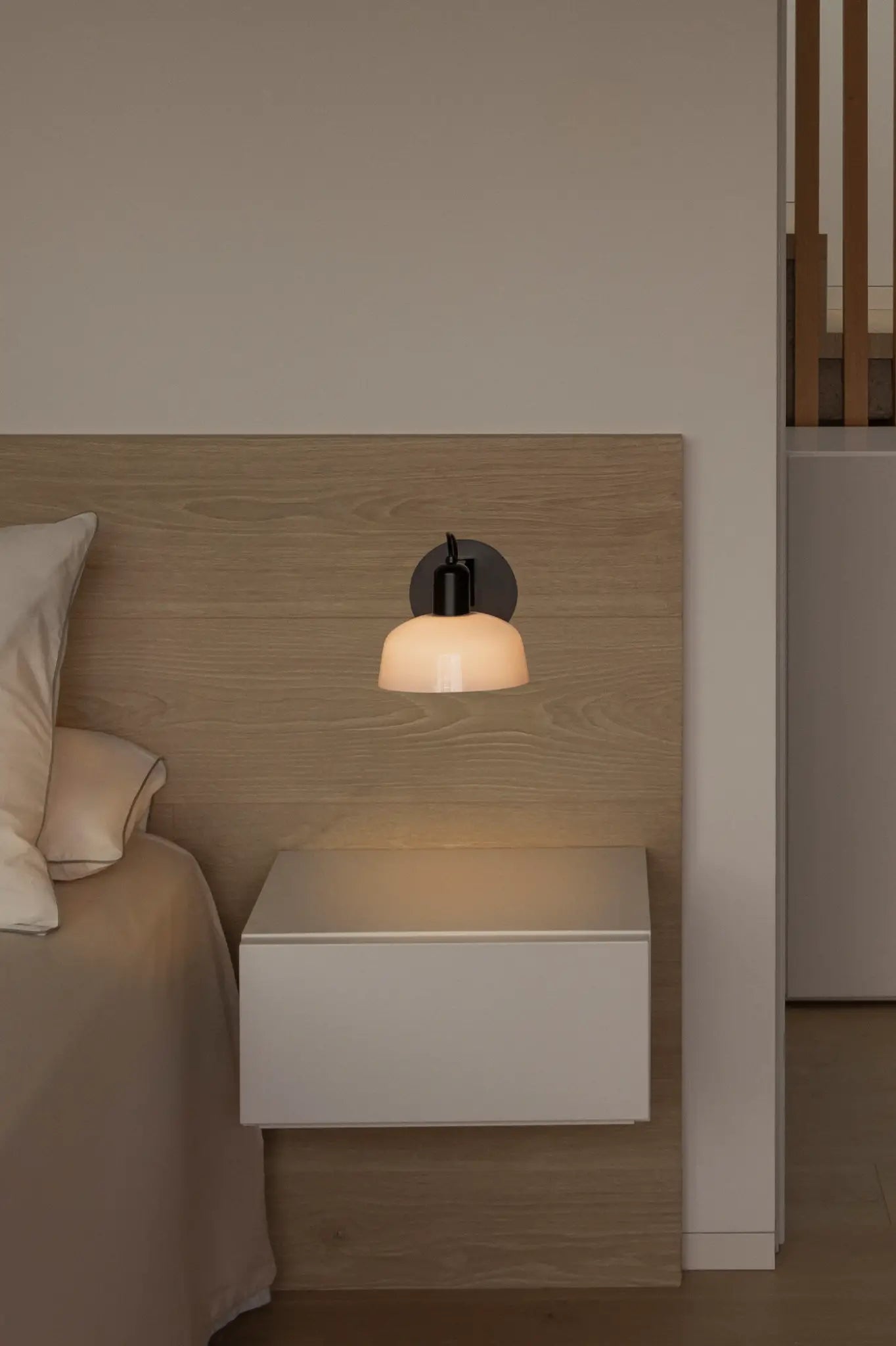Applique murale orientable au design inspiré de l’architecture tunisienne. Finition noir satiné et verre opalin pour une lumière douce et élégante.