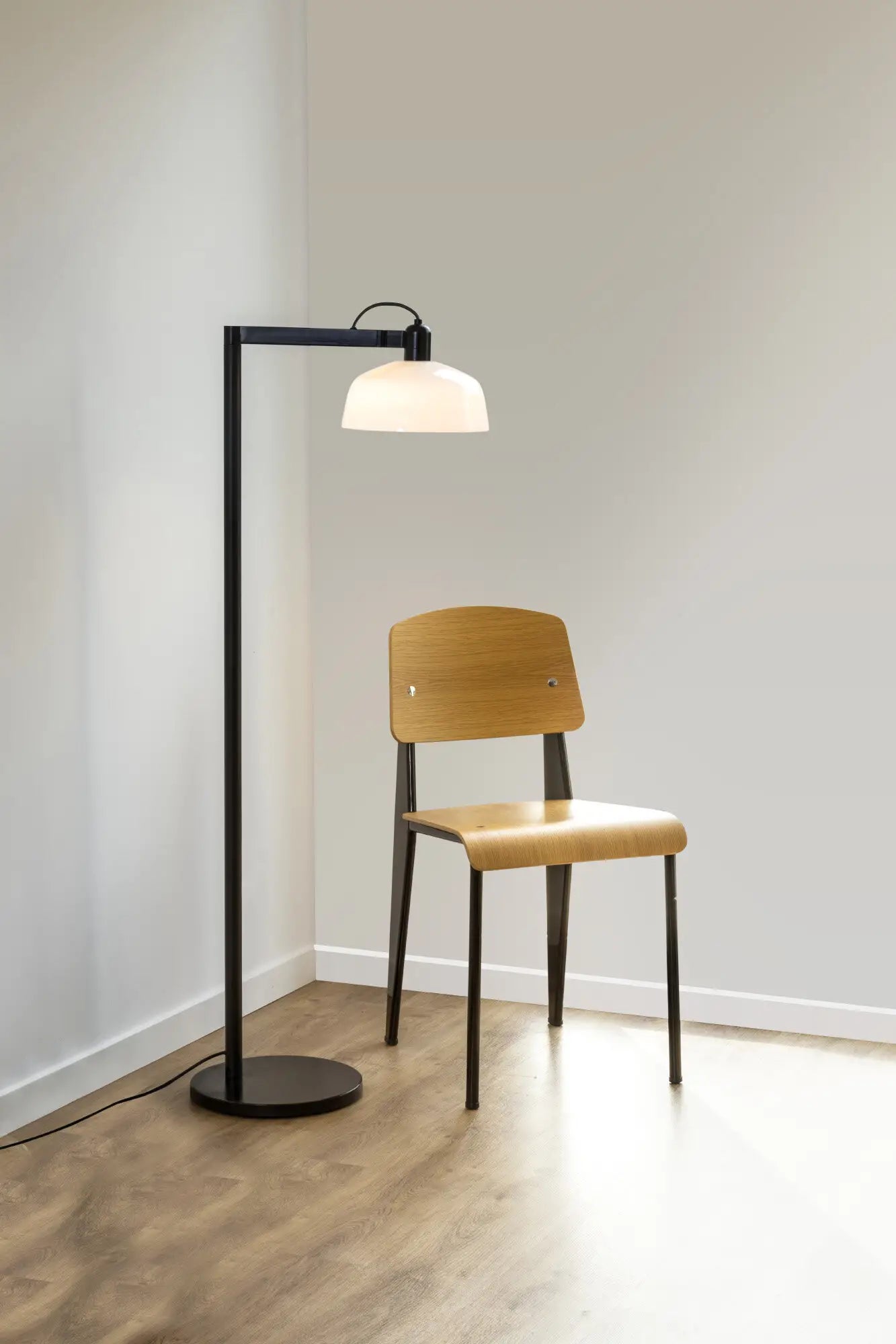 Le lampadaire TATAWIN associe design contemporain et inspiration tunisienne avec son abat-jour en verre opalin et sa structure en acier noir pivotante. Élégance et ambiance chaleureuse garanties.