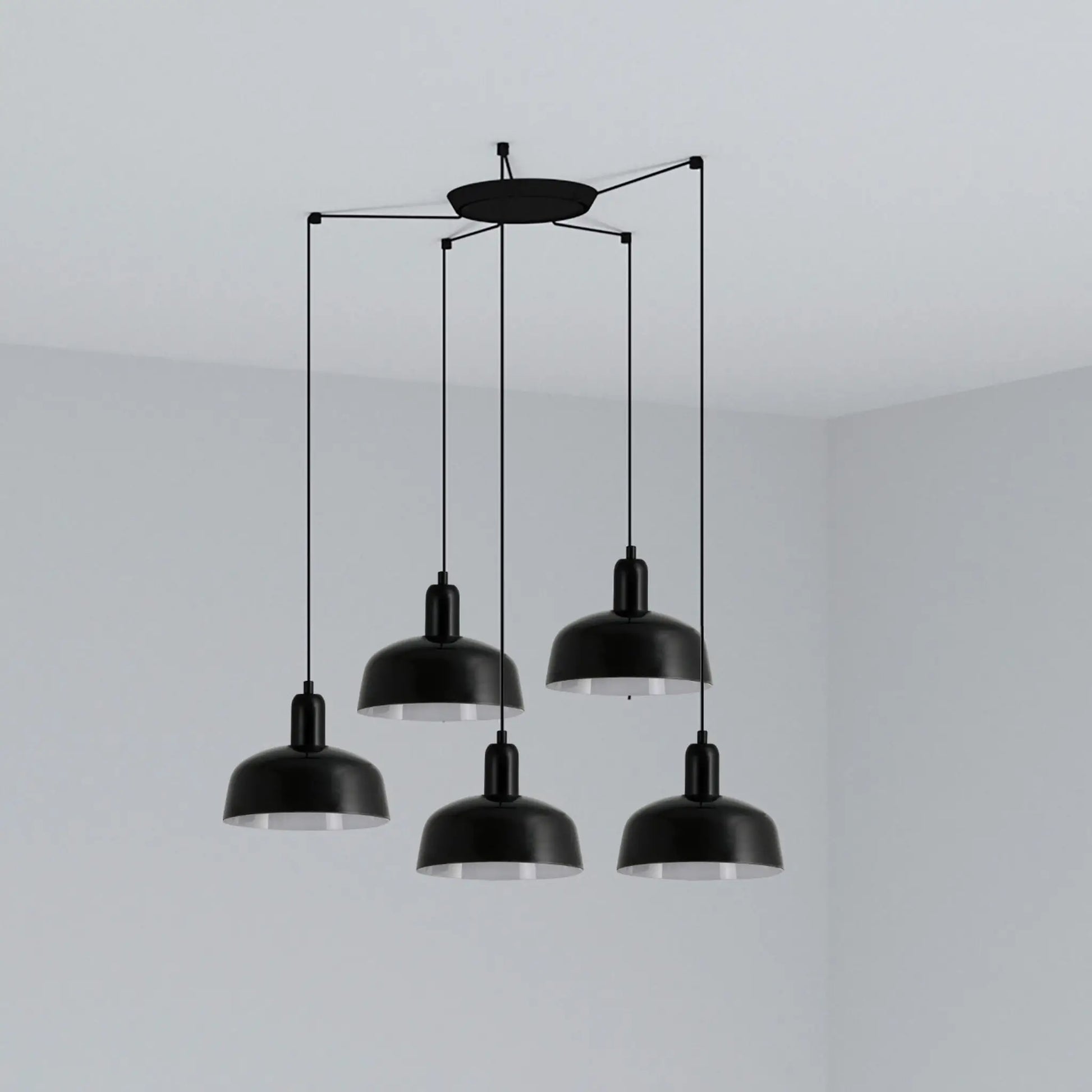 Suspension TATAWIN S avec rosace multiple à 5 lampes, abat-jour en verre opalin blanc et structure en acier noir, idéale pour une lumière ambiante élégante.