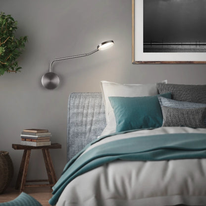 L'applique Knapstein THEA dispose d’un bras de lecture flexible avec une projection maximale de 60 cm. Le bras de lecture peut être réglé selon les besoins sur le support mural ou sur la tête de lampe. La lampe peut être commutée et tamisée en continu via le contrôle gestuel. Le capteur de contrôle gestuel est situé sur la base de la lampe. La lampe est allumée ou éteinte avec un mouvement de la main dans la zone du capteur. Pour atténuer la lampe en continu, la main est maintenue dans la zone du capteur pendant une période plus longue. La THEA de Knapstein est disponible en nickel mat et en noir. Le support mural est fourni avec la surface correspondante pour la lampe. Une LED est intégrée comme source de lumière.