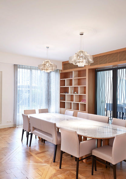 L’élégance intemporelle des courbes, juxtaposée à un matériau résolument contemporain, sculpte la lumière pour créer
