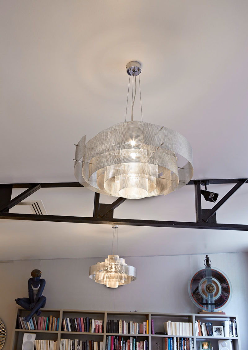 Véritable sculpture lumineuse en inox perforé poli miroir, la suspension Galaxie est réalisée de façon artisanale dans l'atelier parisien du designer.