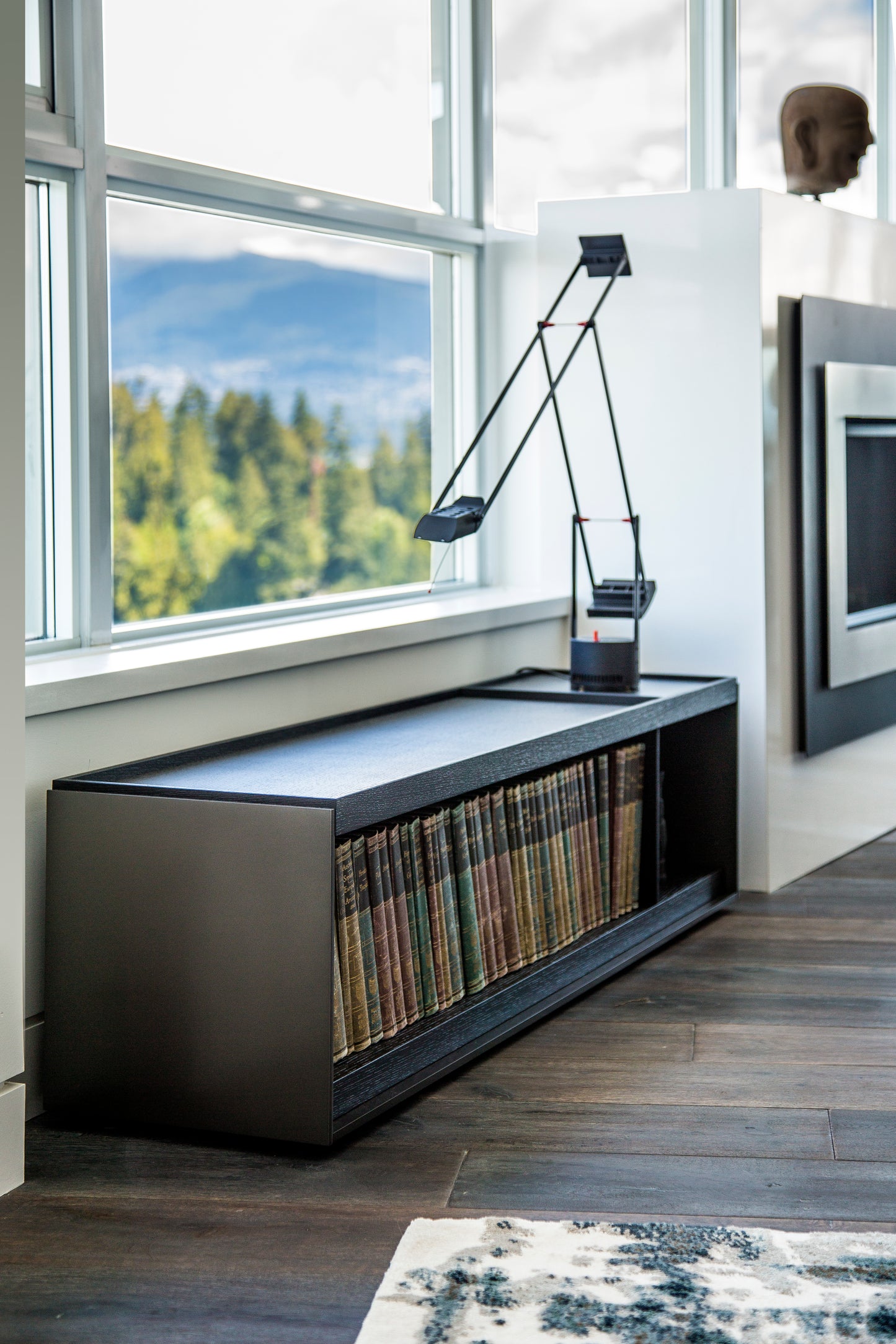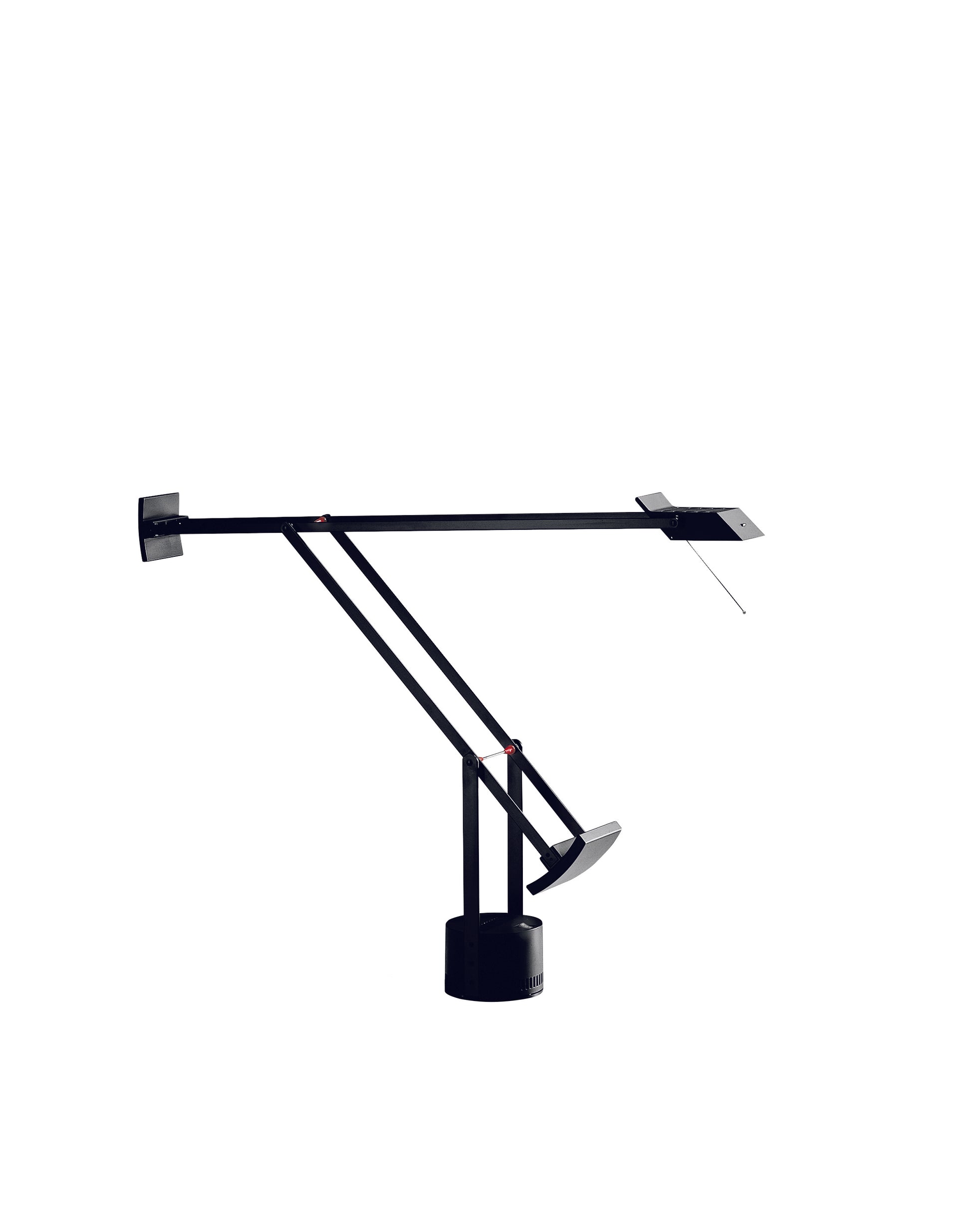 Bras articulés et tête orientable le tout équilibré par le contrepoids en aluminium verni. Disponible en trois dimensions et dans la version Plus avec tête orientable dans le sens transversal. L'innovation reposait dans la conception de sa fabrication: un transformateur situé dans la base de la lampe faisait passer le voltage de 230 à 12V et alimentait une source halogène au travers de tiges et des boutons pression ces derniers servant de conducteurs de courant. Aujourd'hui, la TIZIO évolue et offre un éclairage avec LED intégrée. Emission de lumière directe orientable, à deux intensités lumineuses.