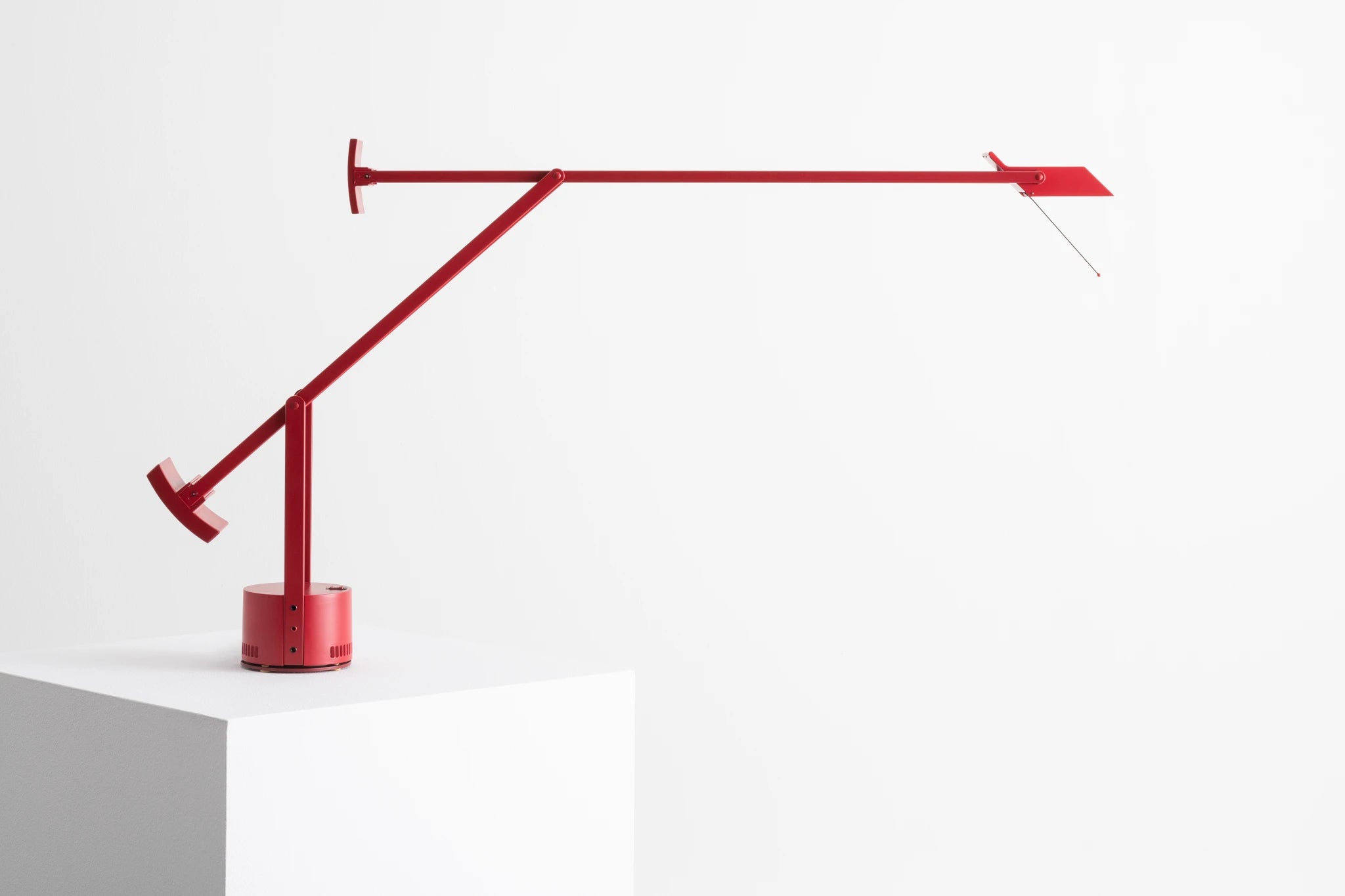 Bras articulés et tête orientable le tout équilibré par le contrepoids en aluminium verni. Disponible en trois dimensions et dans la version Plus avec tête orientable dans le sens transversal. L'innovation reposait dans la conception de sa fabrication: un transformateur situé dans la base de la lampe faisait passer le voltage de 230 à 12V et alimentait une source halogène au travers de tiges et des boutons pression ces derniers servant de conducteurs de courant. Aujourd'hui, la TIZIO évolue et offre un éclairage avec LED intégrée. Emission de lumière directe orientable, à deux intensités lumineuses.