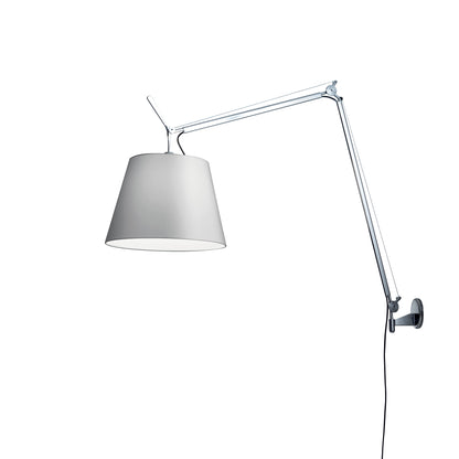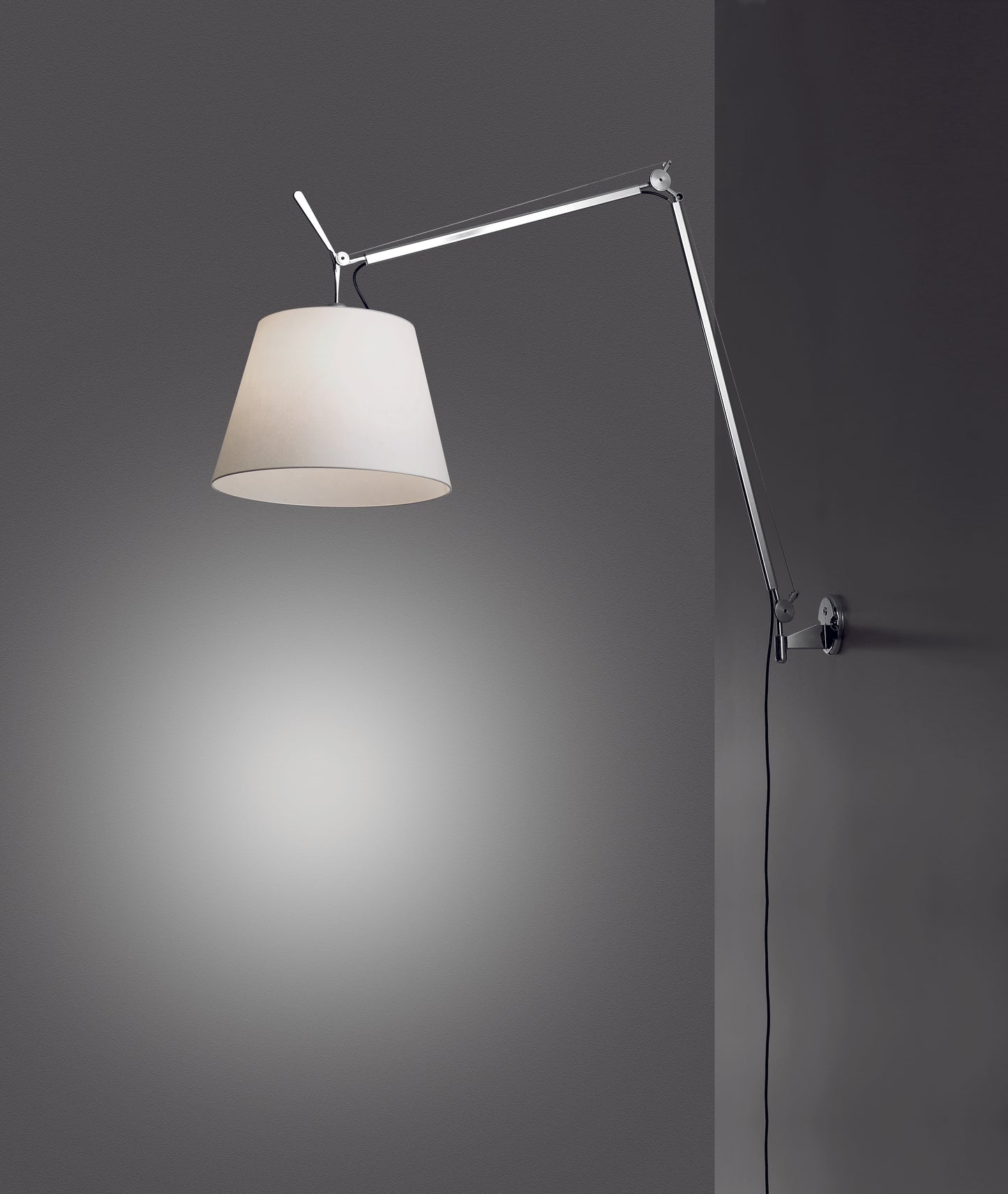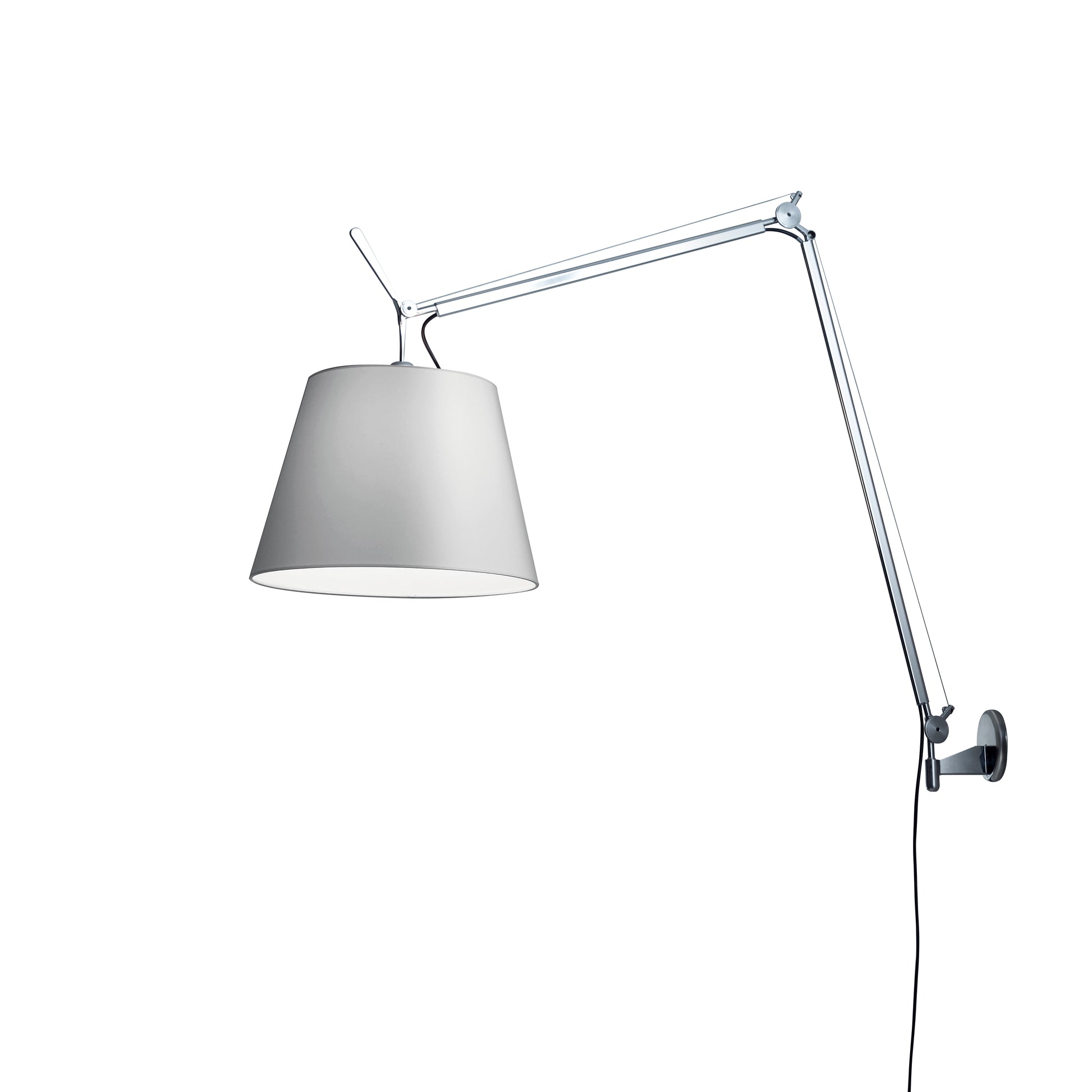 Cette applique se compose d'une structure à bras articulés en aluminium poli et d'un support applique en aluminium brillant. Le diffuseur, orientable dans toutes les directions, peut être en papier parchemin écru ou en polycarbonate recouvert de satin de soie gris ou noir. Le système d'équilibrage est géré grâce à des ressorts. La Tolomeo mega parete émet une lumière directe orientable.