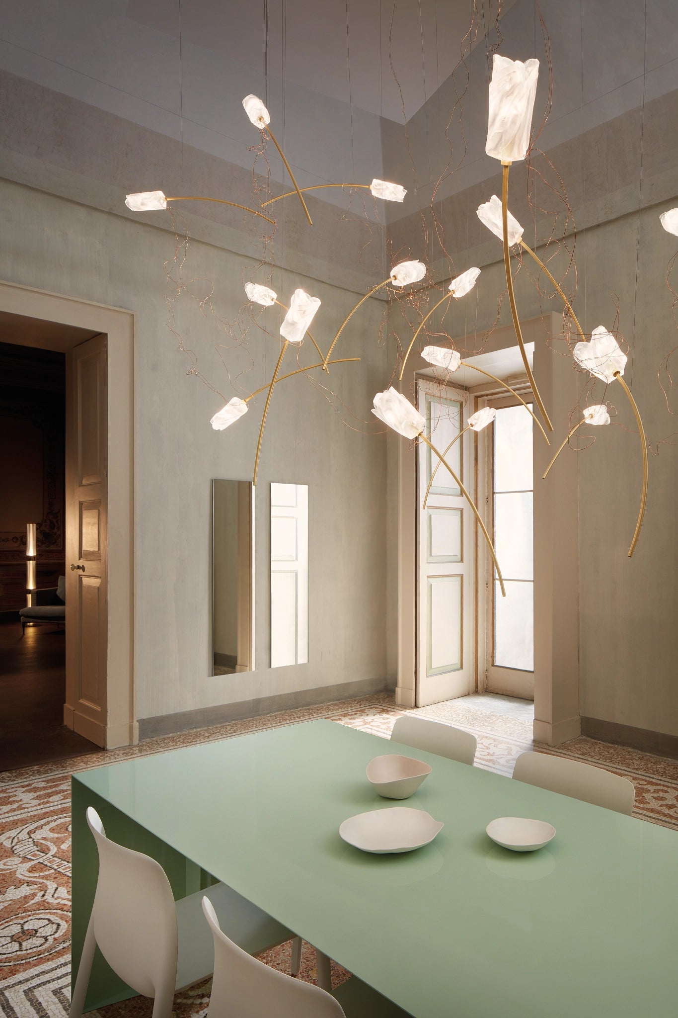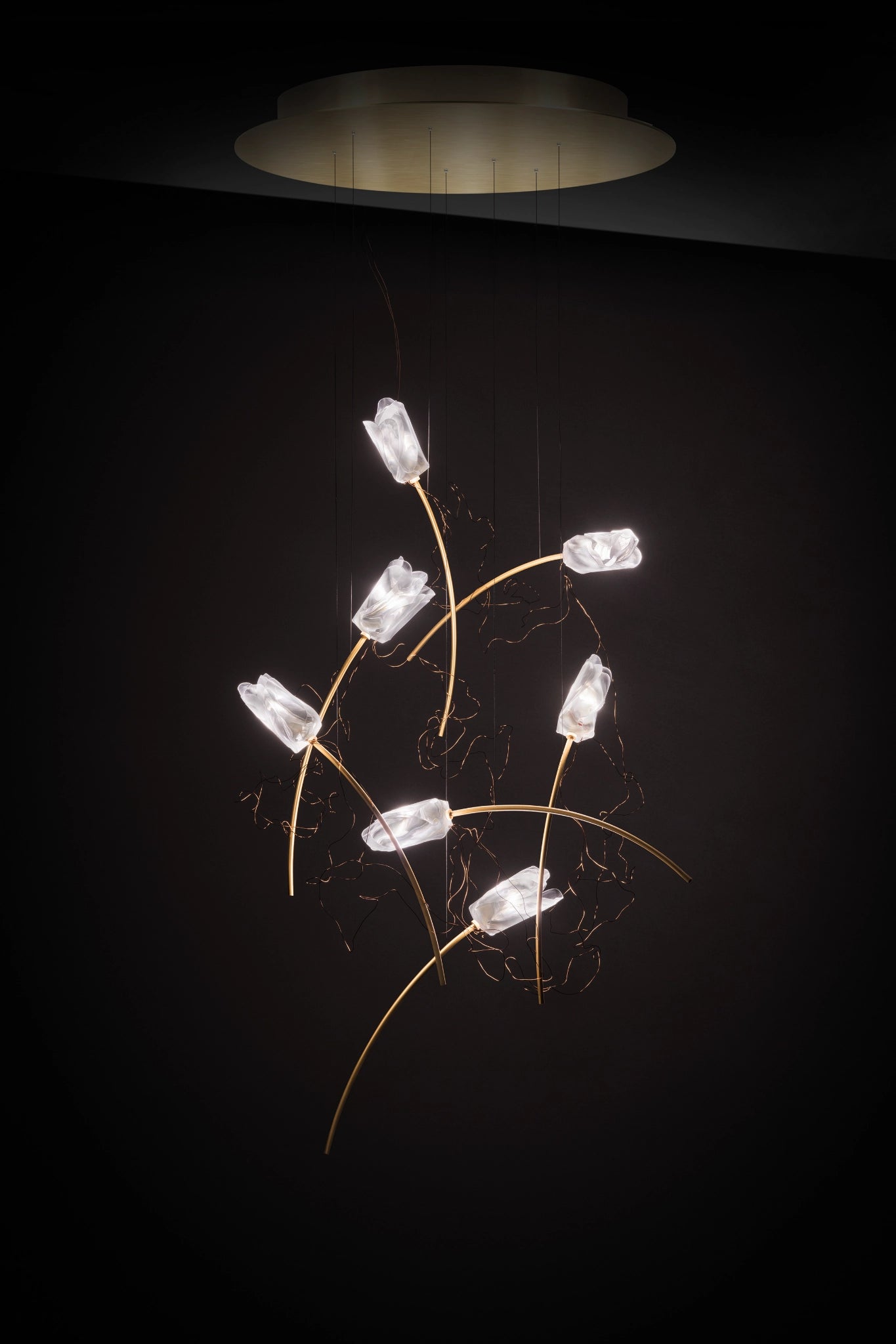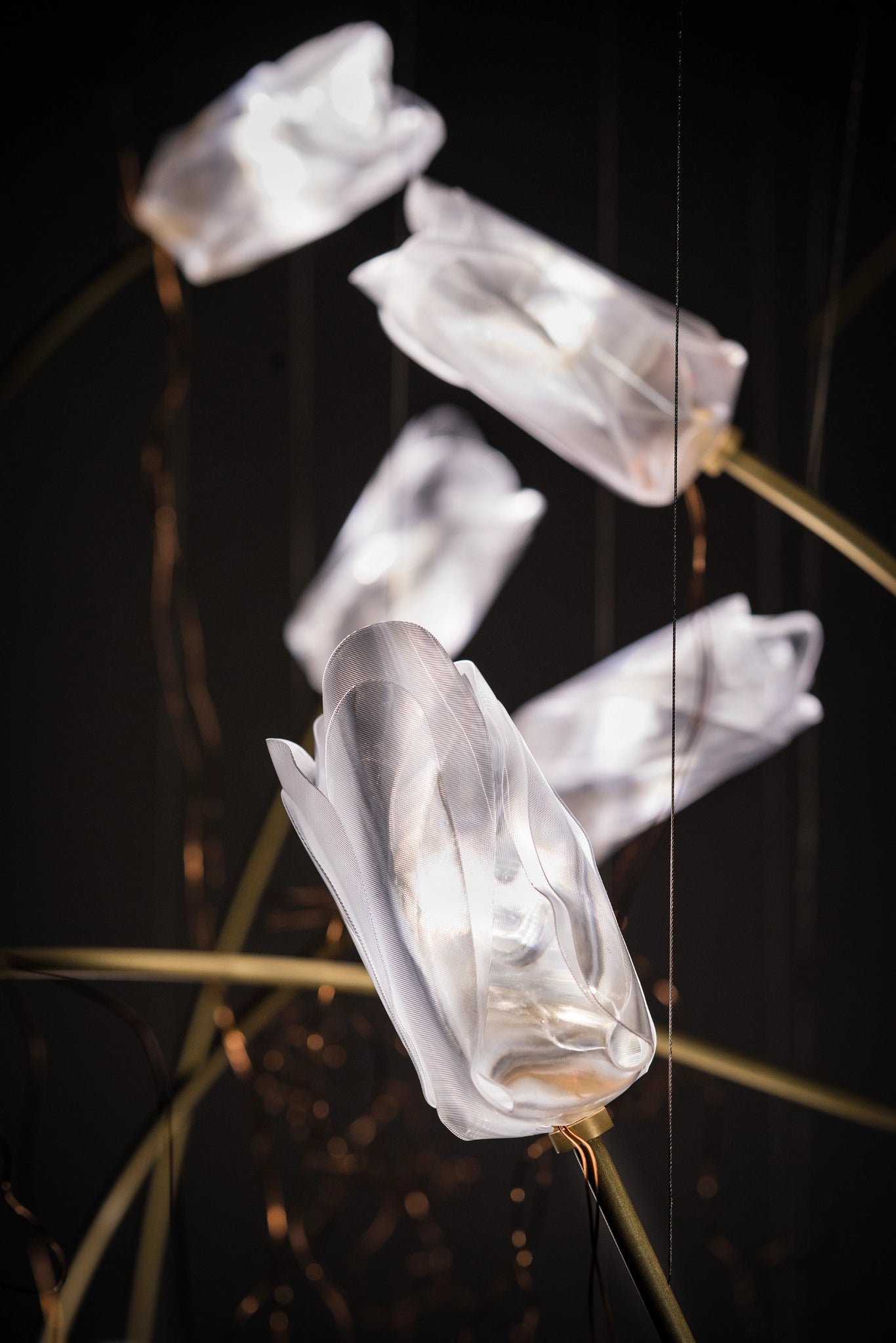 Gracieux, léger et rêveur. Tulip habille littéralement l'air avec une série de tulipes réalisées à partir de corolles Lentiflex®, sculptées à la main façon slump, rendant chaque fleur unique. Parfois, des câbles en acier invisibles maintiennent une fleur rougeoyante s'épanouissant sur une tige en laiton brossé inclinée de manière prédéterminée pour suggérer une forme naturelle flottant dans l'espace. Chaque tulipe est connectée en série avec la tulipe suivante par un enchevêtrement complexe de fils de cuivre qui conduisent à basse tension électrique. La collection est présentée en configurations plug-and-play (7 ou 14 fleurs suspendues à des platines rectangulaires ou circulaires en laiton brossé) ou en pose libre, permettant une installation par multiples de 14 selon vos goûts. Une source de lumière LED est incluse et peut être remplacée indépendamment.