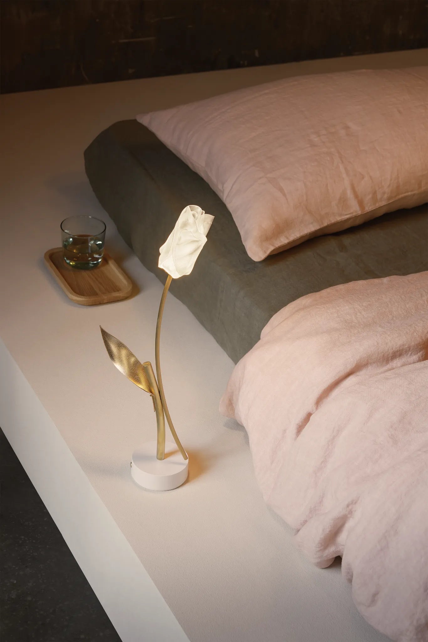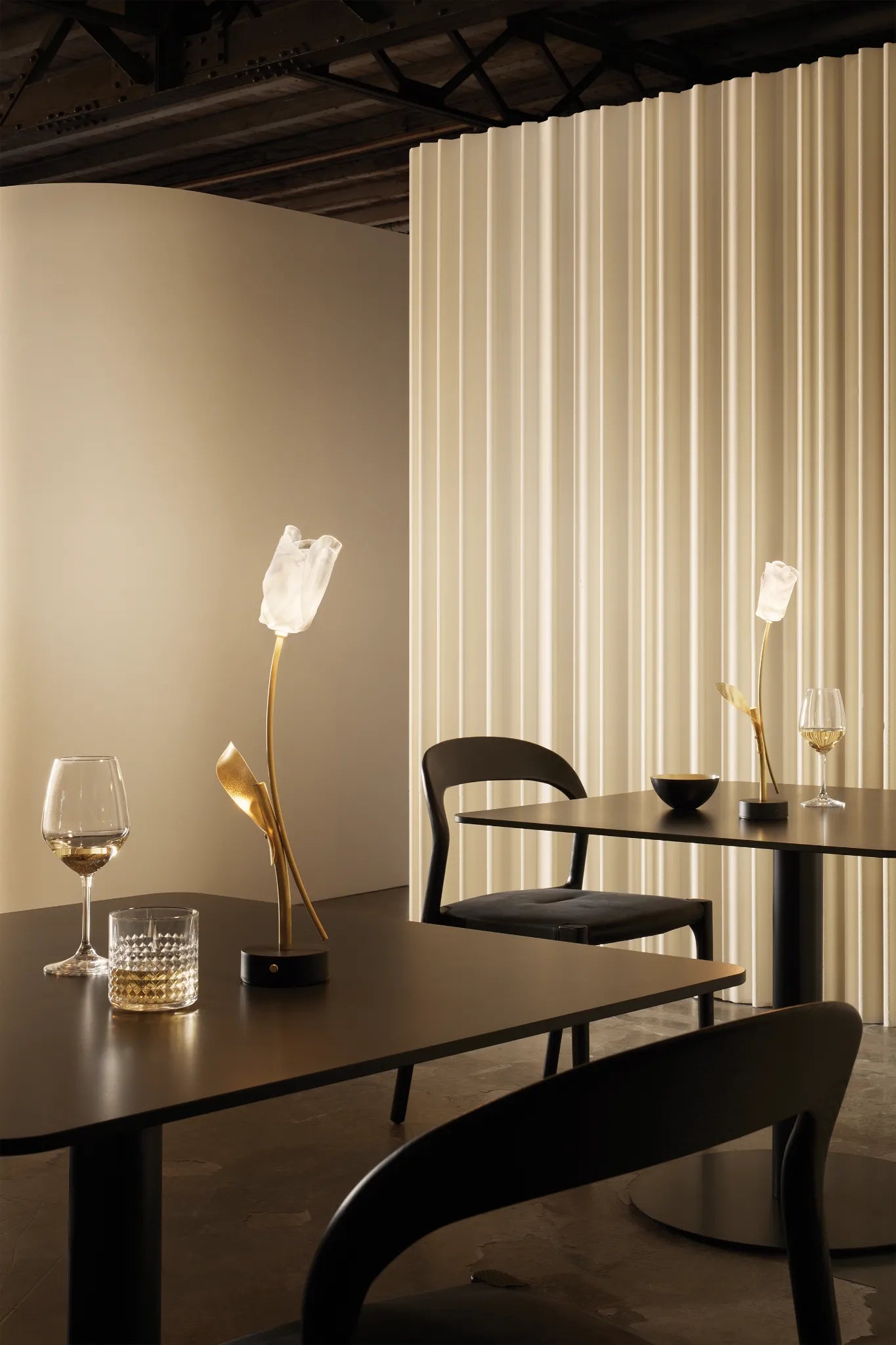 Tulip, installation lumineuse romantique de Marc Sadler, qui renferme une source lumineuse en LED, donne naissance à une fleur onirique qui – légèrement penchée – semble s’épanouir et bouger dans l’air, en dialoguant avec l’espace environnant.
