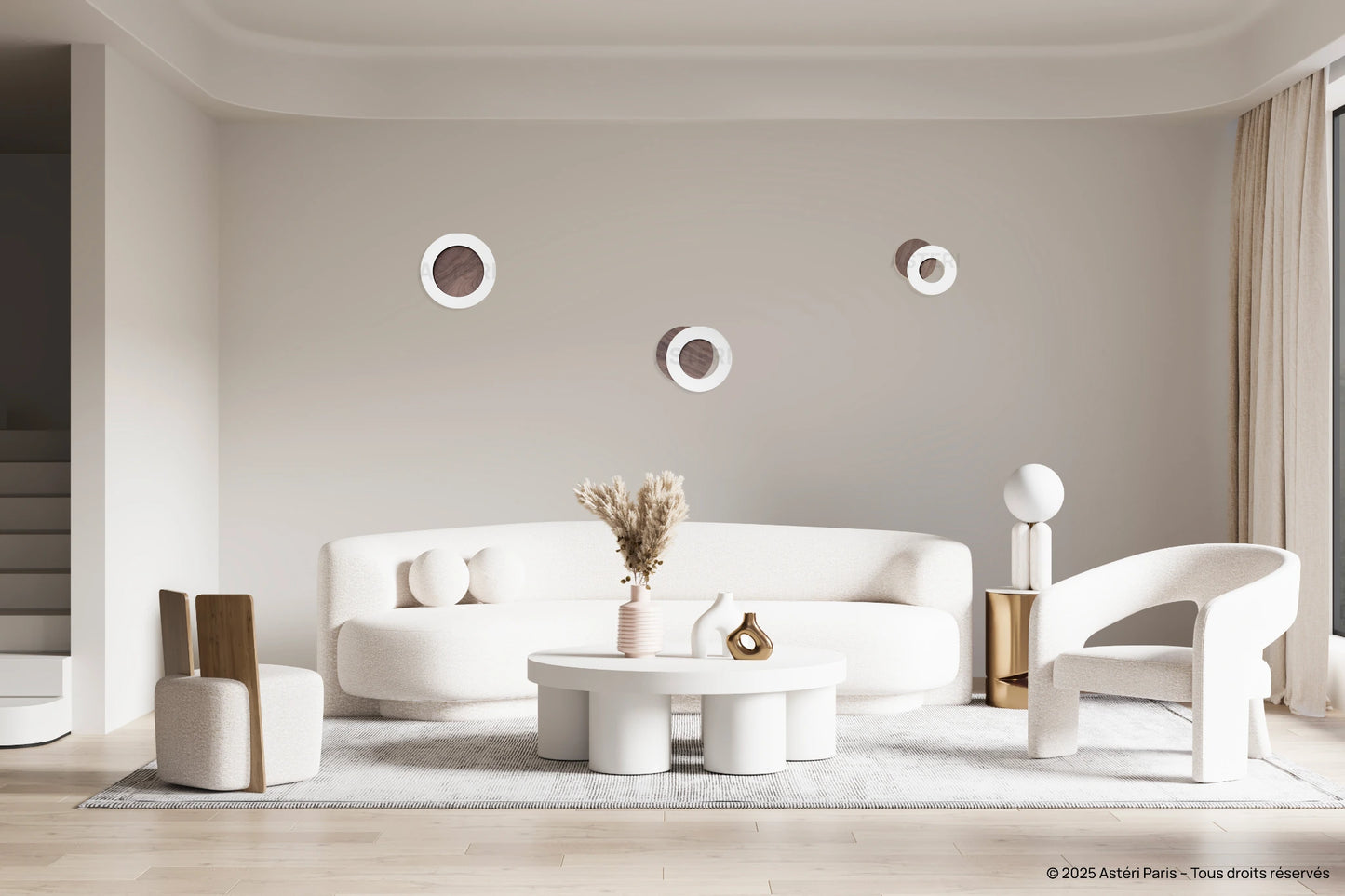 Avec son diamètre intermédiaire, la Vera 26 cm trouve sa place dans tous les environnements : chambre, salon, couloir ou bureau. Sa structure se compose d’un disque mural en bois de noyer et d’un anneau LED orientable qui offre un éclairage personnalisable selon vos envies. Issue de la rencontre entre Astéri et Icone Luce, cette version existe en trois finitions d’anneaux : blanc, noir ou doré. À fixer au mur ou au plafond, Vera combine esthétique contemporaine et flexibilité fonctionnelle.